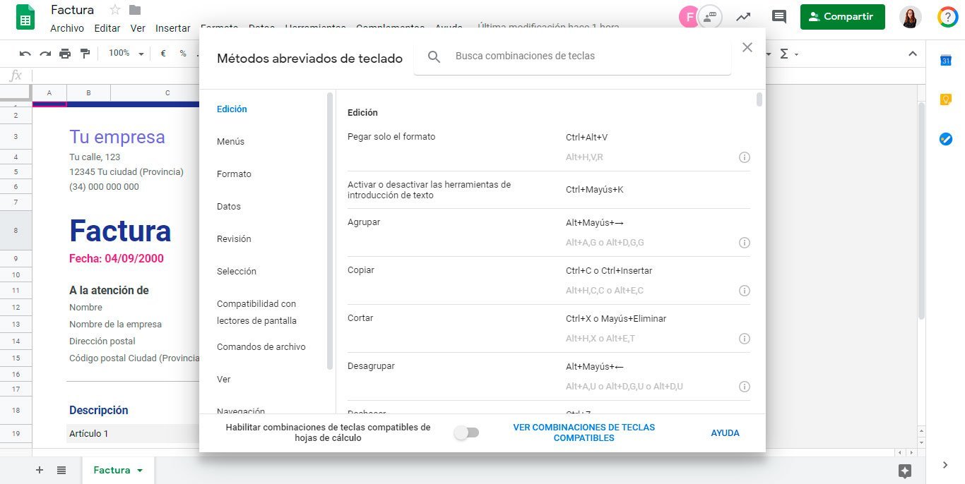 Los atajos de teclado permiten trabajar rápidamente y familiarizase de mejor manera con la interfaz de Google Sheets, puedes encontrarlos en Menú Ayuda> Combinaciones de teclas, o si no pulsando Ctrl+/ en el teclado.