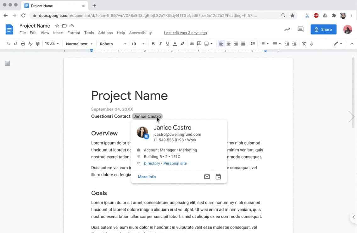 O Google Workspace também adiciona mais inteligência. Especificamente, com seu chip inteligente teremos muitos mais informações sobre a pessoa que mencionamos, Um arquivo aparece automaticamente com seus dados e ações sugeridas, com base na atividade anterior.