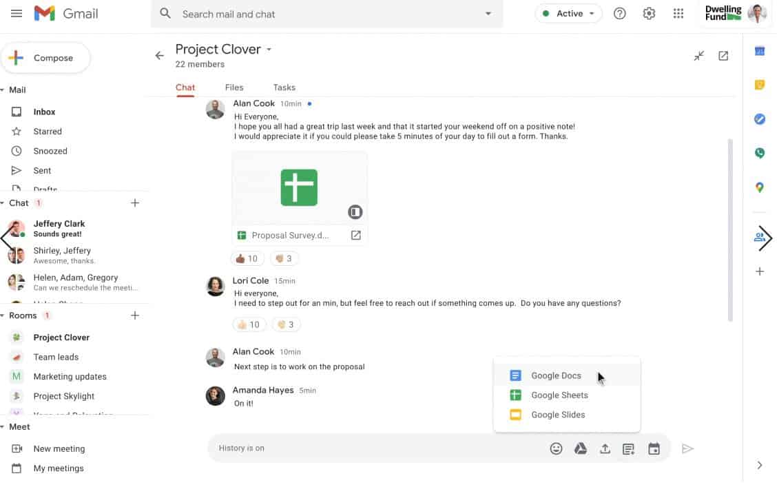 O primeiro novo recurso introduzido Google Workspace para melhorar a integração de todo o seu sistema, é a possibilidade de criar os documentos diretamente das salas do Google/Gmail. Isso permite ao usuário economizar tempo abrindo o Google Drive, criando o documento e compartilhando-o com sua equipe, já que com esta função as três ações ficam resumidas em uma só.